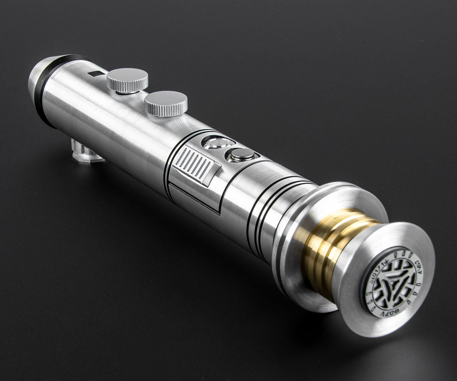 The focal point of the hilt is a gorgeous brass emitter which provides a vibrant contrast to the sleek design.